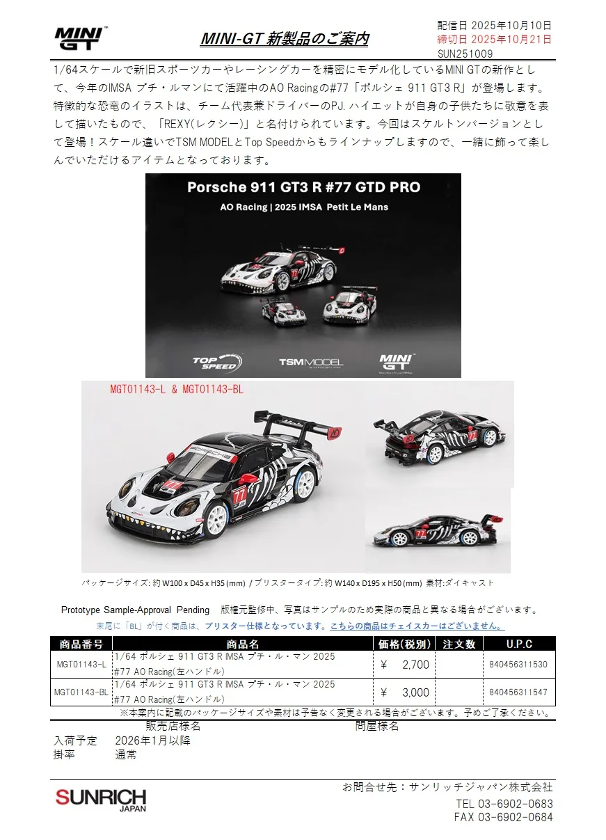 ◎MGT01143-L ポルシェ911 GT3 R IMSA プチ・ル・マン 2025 #77 AO Racing(左ハンドル)※箱