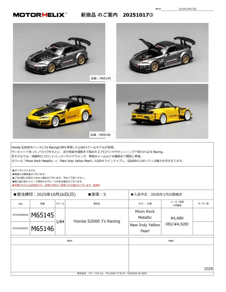 ◎M65146 Honda S2000 J's Racing New Indy Yellow Pearl