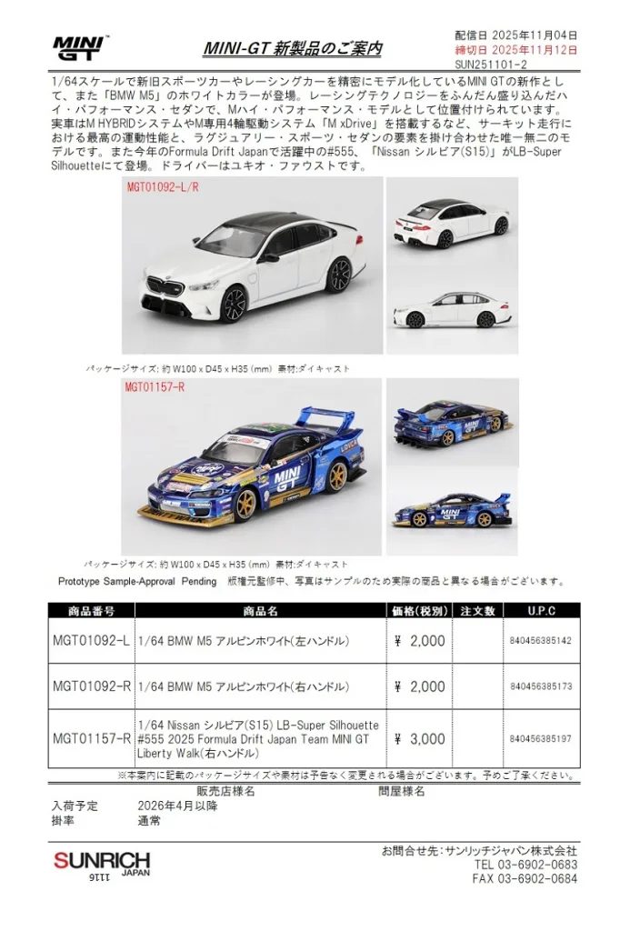 ◎MGT01157-R 1/64 Nissan シルビアS15 LB-Super Silhouette #555 2025 Formula Drift Japan Team MINI GT Liberty Walk 右ハンドル