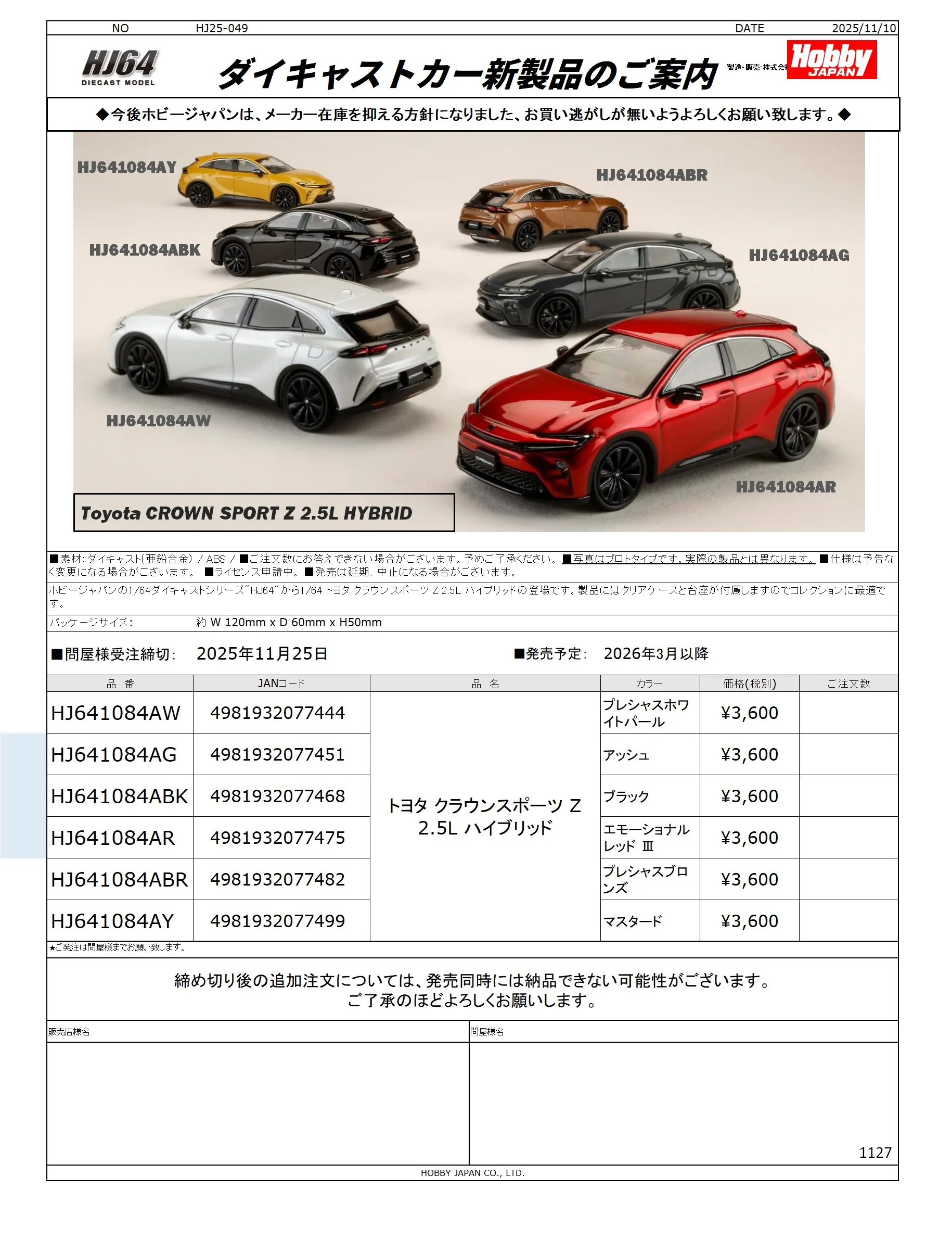 ◎HJ641084ABK トヨタ クラウンスポーツ Z 2.5Lハイブリット ブラック