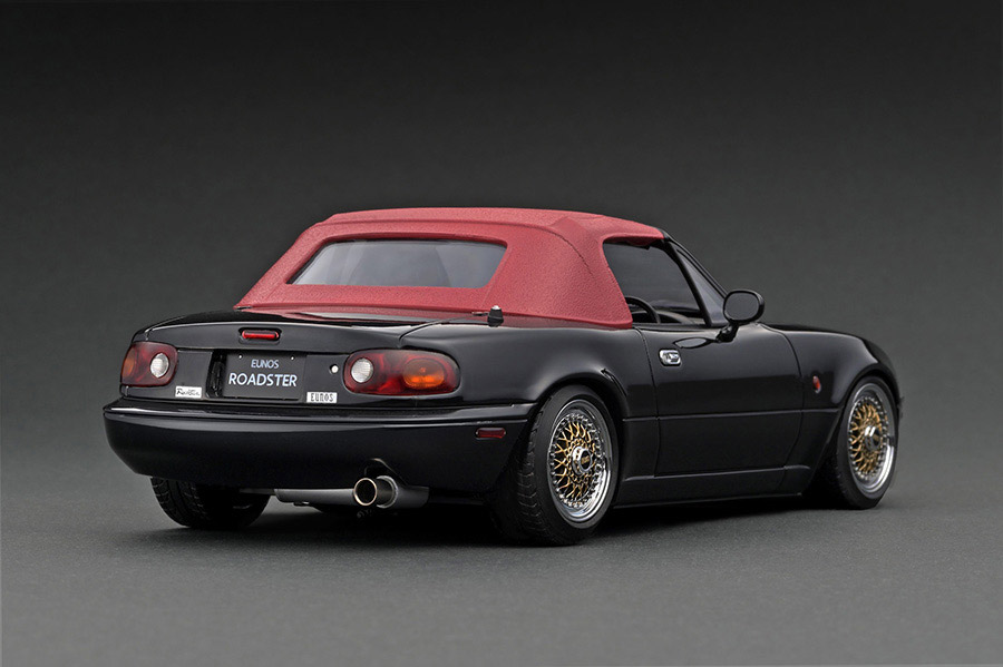 ユーノスロードスター(NA) の限定車「Sリミテッド」をモチーフにしたライトカスタム仕様を1/18スケールレジンモデルで再現。ボディカラー:ブラック、内装カラー:レッド。14インチメッシュホイールにローダウン仕様。純正リップスポイラー、幌/幌カバー(レッド)、大径マフラー、ロールバー(ブラック)、ナルディタイプステアリング(ブラック)、純正シート装着。幌はマグネットで脱着可能なパーツ2種を付属。